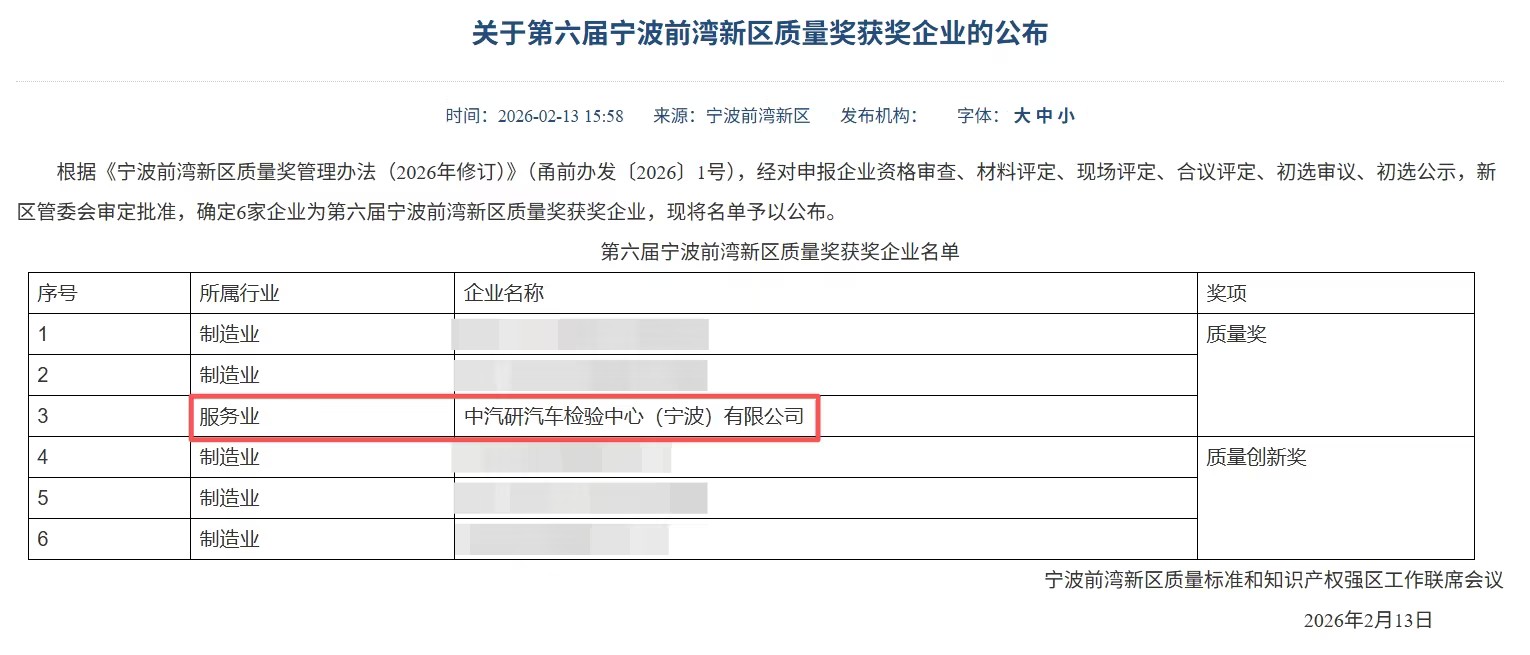 喜報|寧波檢驗中心榮獲第六屆寧波前灣新區質量獎